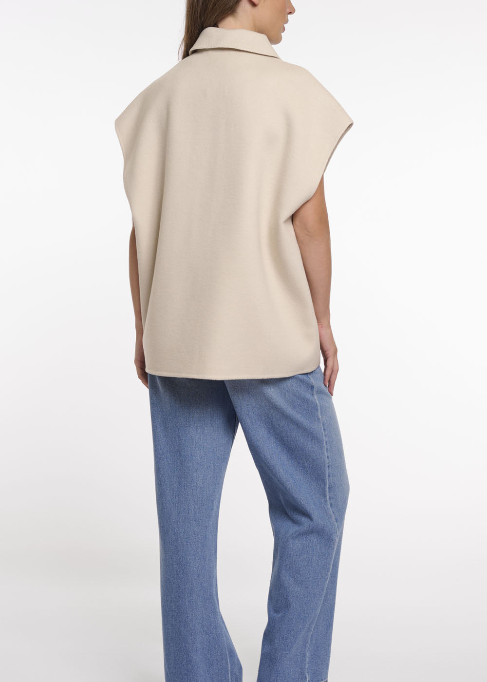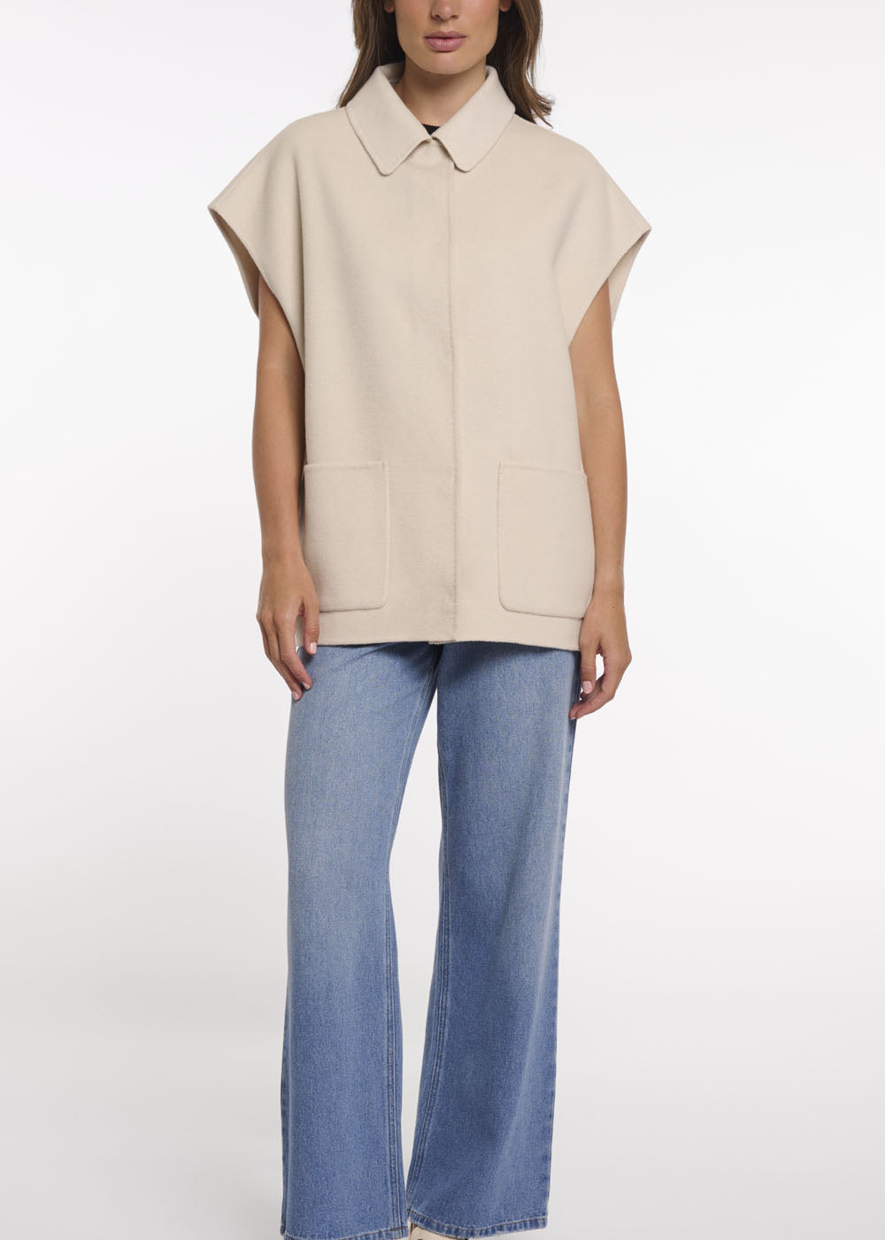Sublimez votre style avec la cape sans manches Ann Tuil modèle Céline au look contemporain. Confectionnée dans un tissu doux et fluide, elle épouse confortablement les épaules. Dotée d'un col structuré, d'une fermeture boutonnée sur le devant et de deux poches plaquées aux coutures soignées, elle offre une silhouette épurée et discrète. Sa coupe décontractée aux épaules apporte une touche de modernité et permet de la superposer facilement à des blouses ou des pulls.