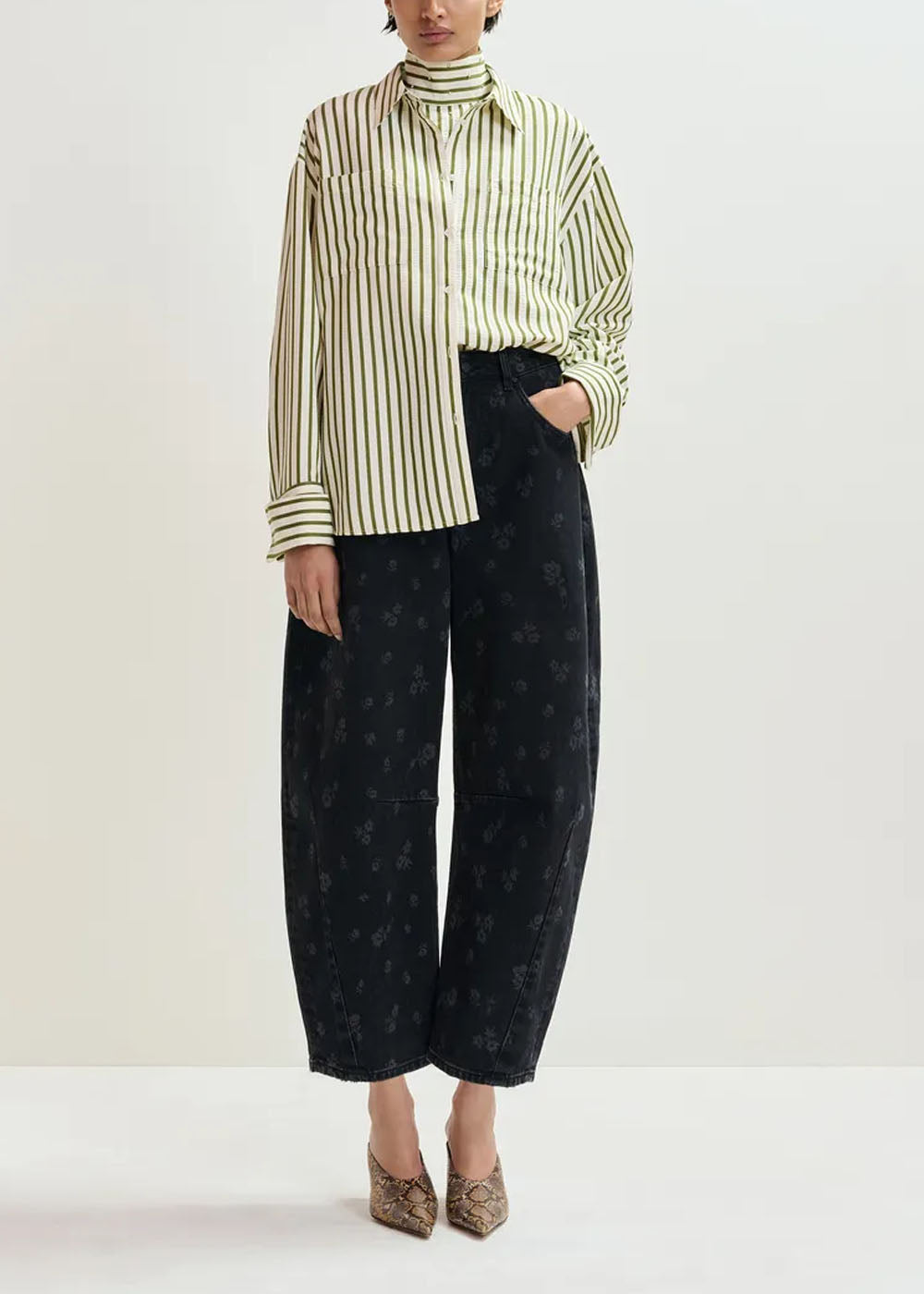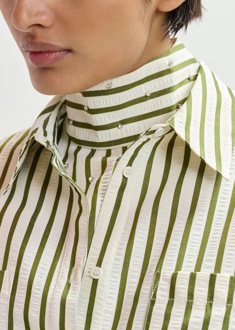 Pensée dans une coupe intentionnellement oversize, cette chemise à rayures associe des éléments de chemise classiques à des détails de texture inattendus. Elle est dotée d'une fermeture à boutons, de deux poches poitrine et d'un pan arrondi plus long dans le dos pour offrir un drapé fluide. Les subtils ornements en strass ajoutent une touche d'éclat. Un plastron assorti est glissé sous la chemise, avec fermeture à glissière dissimulée pour une superposition lisse.