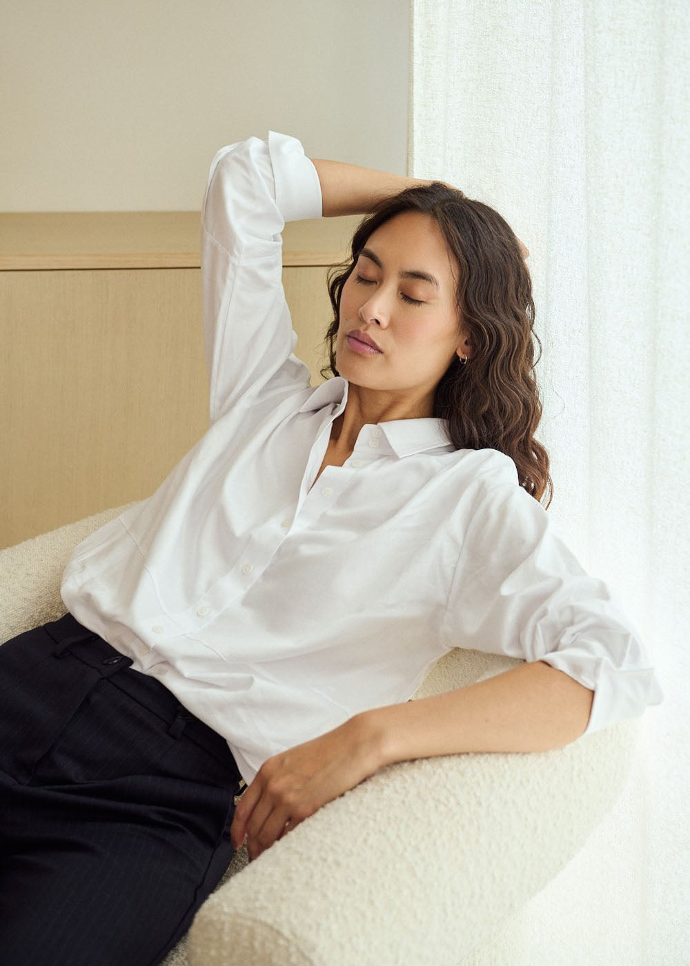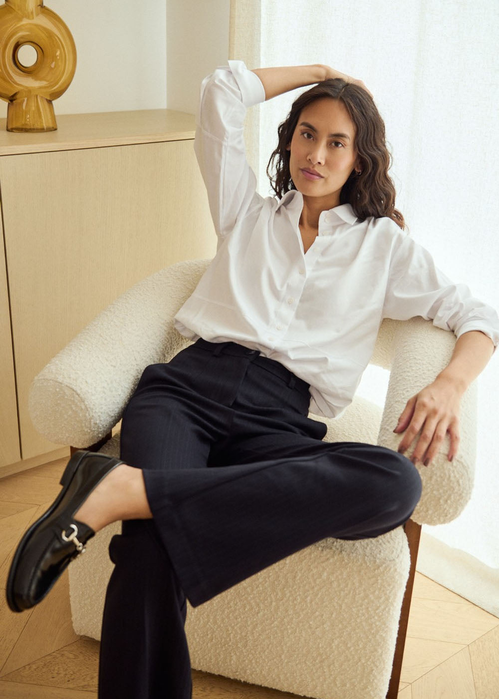 Une pièce intemporelle revisitée : la chemise Hana San Dyani élégante et cintrée sublime la silhouette avec raffinement. Son détail distinctif, une cravate amovible, apporte une touche moderne et versatile, permettant de jouer entre allure classique et esprit contemporain.