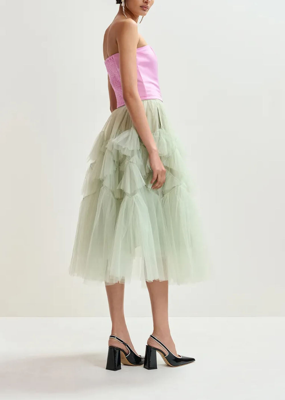 Jupe mi-longue sculpturale composée de couches de tulle aéré, élégamment agencées en volants gracieux qui créent du volume et du mouvement. Elle présente une coupe ajustée à la taille, dotée d'une bande de taille en satin lisse qui met en valeur sa silhouette raffinée. La fermeture éclair dissimulée assure une ligne nette et ininterrompue, tandis que les poches fendues discrètes ajoutent de la fonctionnalité. La doublure en satin offre une protection confortable.