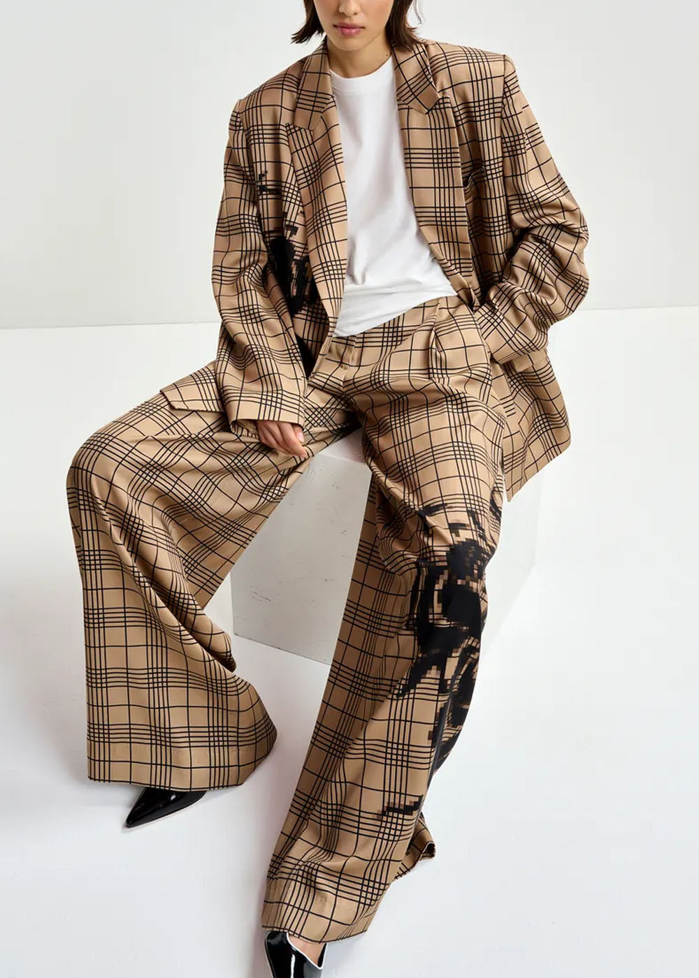 Taillé dans une coupe décontractée à jambe large, ce pantalon à carreaux vous offre une sensation de mouvement et de structure. Il se voit équipé d'une fermeture à glissière et bouton classique, de poches italiennes et de passants de ceinture, tandis qu'une couture latérale incurvée modifie subtilement les proportions. Un imprimé graphique placé accentue les lignes épurées.
