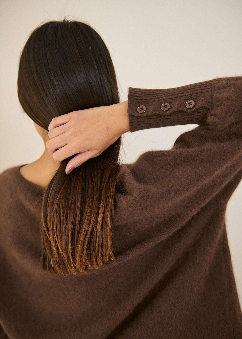 Le pull en cachemire Vera 22BBSW25 allie douceur, élégance et confort. Avec sa coupe légèrement ample et ses manches longues resserrées aux poignets, il crée une silhouette fluide et féminine. Son col rond classique met en valeur le port de tête, tandis que le détail des boutons aux poignets apporte une touche raffinée et subtilement travaillée. Dans un brun profond et chaleureux, il s’associe aussi bien à un jean qu’à un pantalon plus habillé. Une pièce essentielle du vestiaire, à la fois cosy et chic.