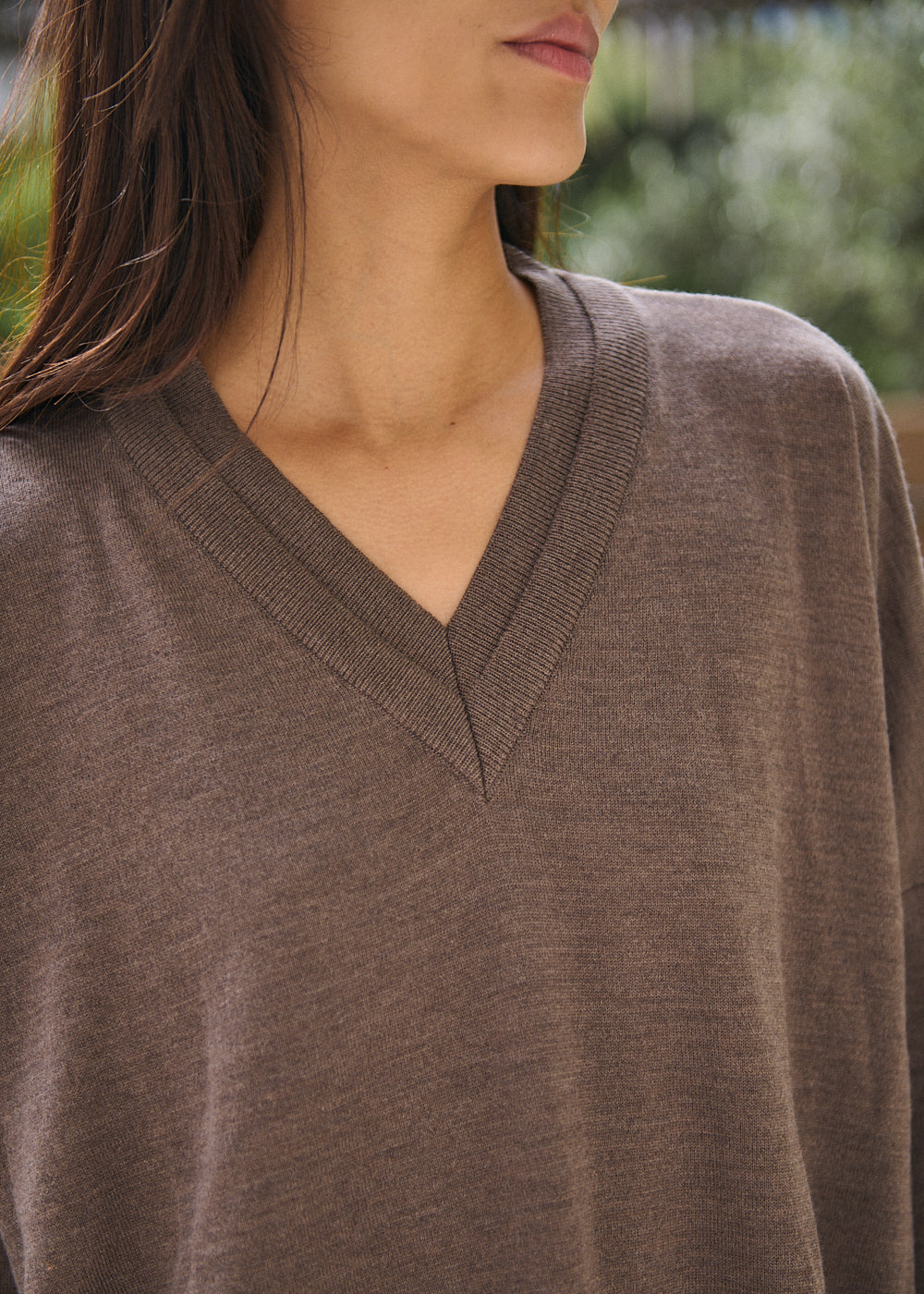 Le pull Hana San Erik en laine mérinos séduit par sa simplicité travaillée. Son col V met en valeur le port de tête, tandis que sa coupe droite, légèrement plus longue à l’arrière, structure la silhouette avec naturel. La teinte taupe s’accorde facilement à votre vestiaire, pour une allure douce et contemporaine au quotidien.