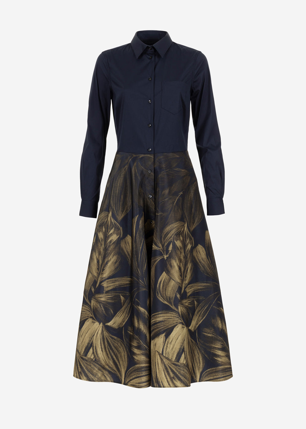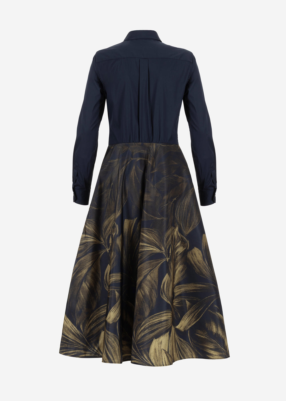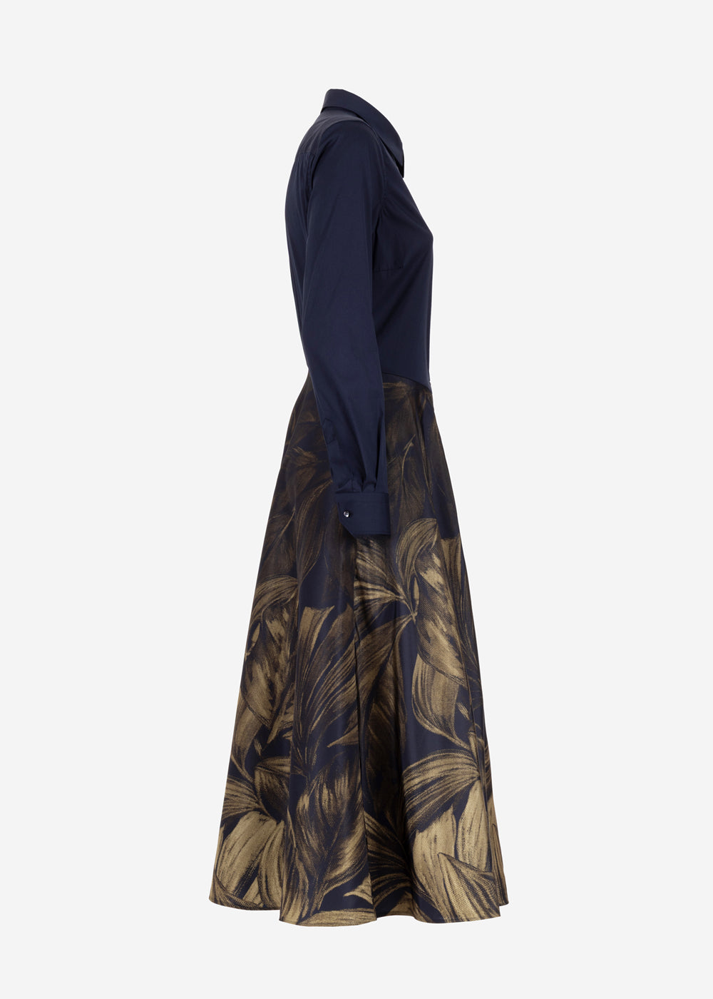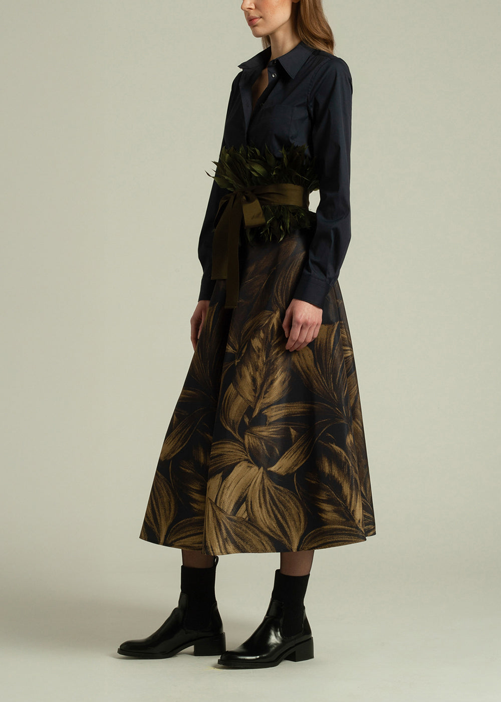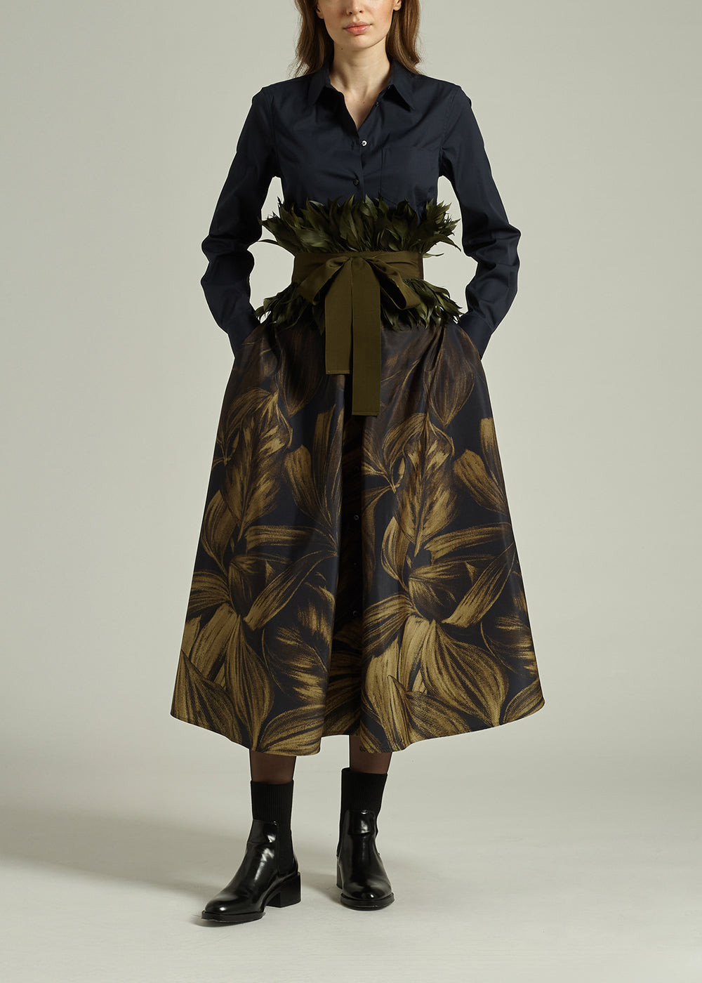 Robe chemise mi-longue boutonnée Sara Roka modèle Nydia85 à manches longues avec jupe évasée en popeline stretch bleu marine et jupe en technopolyester imprimé. Imprimé feuillage placé bleu marine et vert. Fermeture par boutons en nacre. Ceinture en ruban gros-grain ornée de plumes, vert militaire incluse.